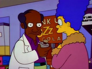 Sanjay fouille le manteau de Marge et découvre qu’elle a voulu partir sans payer sa bouteille de bourbon du Colonel Kentucky.
