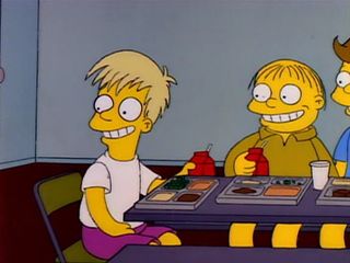 Avec son copain, il est admiratif lorsque Lisa alias Little Miss Springfield les salue.