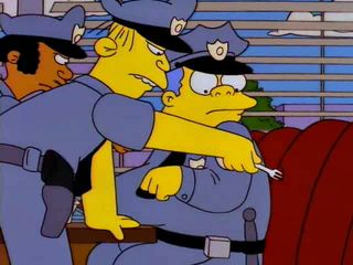 Homer se demande qui à flingué l'autodialeur de Marge mais Clancy lui ordonne de se rendre au tribunal avec la preuve sinon il n'y aura pas de poursuites. |  |