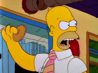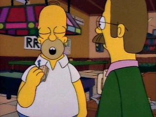 Il est en train d’en dévorer une boîte dans le divan quand il entend les dégâts qu’a fait l’incendie de Springfield.