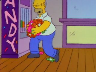Il demande de la monnaie à Marge, s’énerve sur la machine à friandises pour en récupérer et demande à Marge de se grouiller car ils rentrent à la maison.